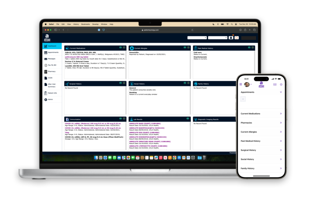 The Althea Health Patient Portal seamlessly connects your practice with your patients, enhancing their care experience. Patients can conveniently update demographic and clinical information, sign forms, pay balances, receive messages, check-in remotely, and more—all subject to clinician review.